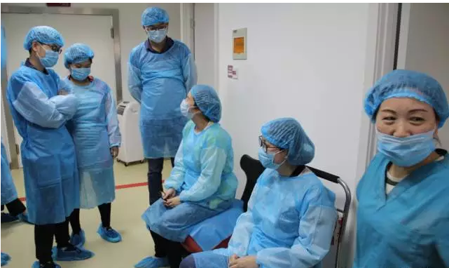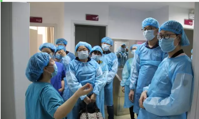 理论过后,刘产长就带着大家来到红房子六楼产房,因为产房是一个完全无菌的场所,所以进去之前每一个人都必须换上无菌服,带好帽子、口罩、鞋套,进行手部消毒。