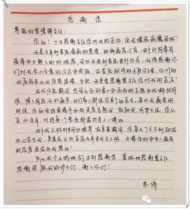 对于在这样高温的天气,患者亲自送来感谢信,贾主任感动不已,但由于患者急着上班,并没有在贾主任的办公室多留,所以二人也只是寒暄了几句。贾主任说道:“从医几十年,并不是没有收到过感谢信,但是真没想到这位患者在这么热的天还能给我送来这封感谢信,真的是太感动了!接过信的时候,纸都是热的!作为医生,治病救人本身就是天职,我一定是要全心全意为病人服务的,这个毋庸置疑,不管是以前还是现在或是将来。从病人踏进我的办公室那一刻起,我就要对她负起责任来。”